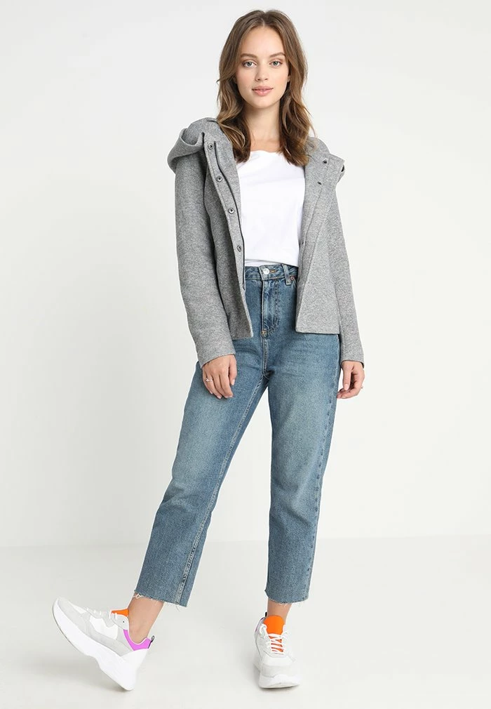 - Details: Button row, shoulder pads
